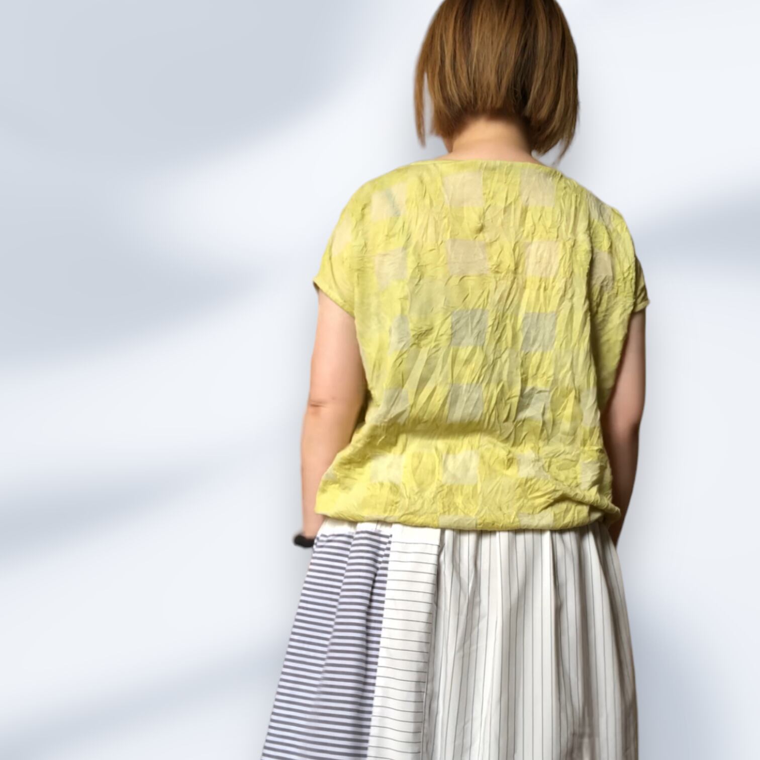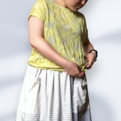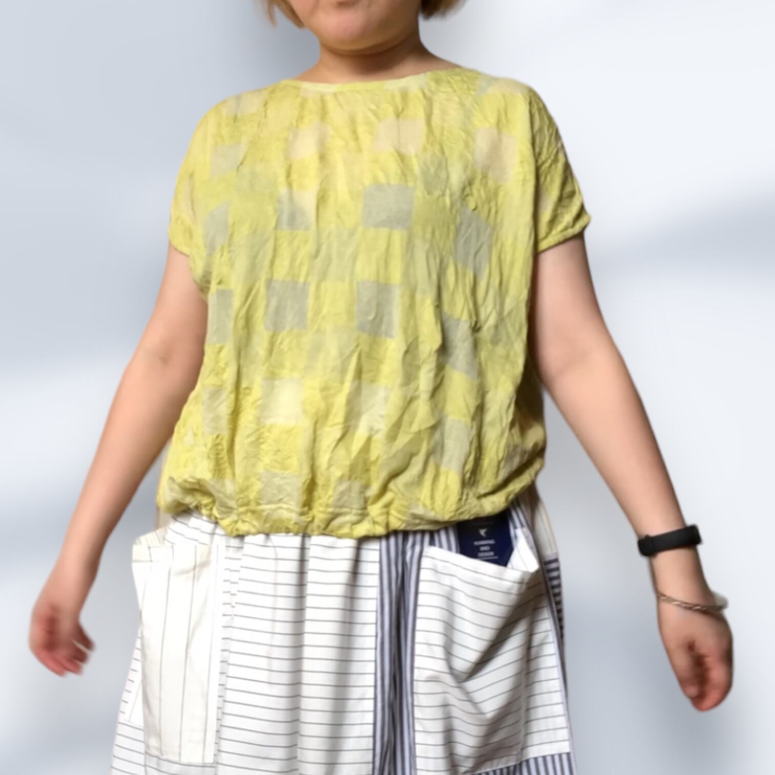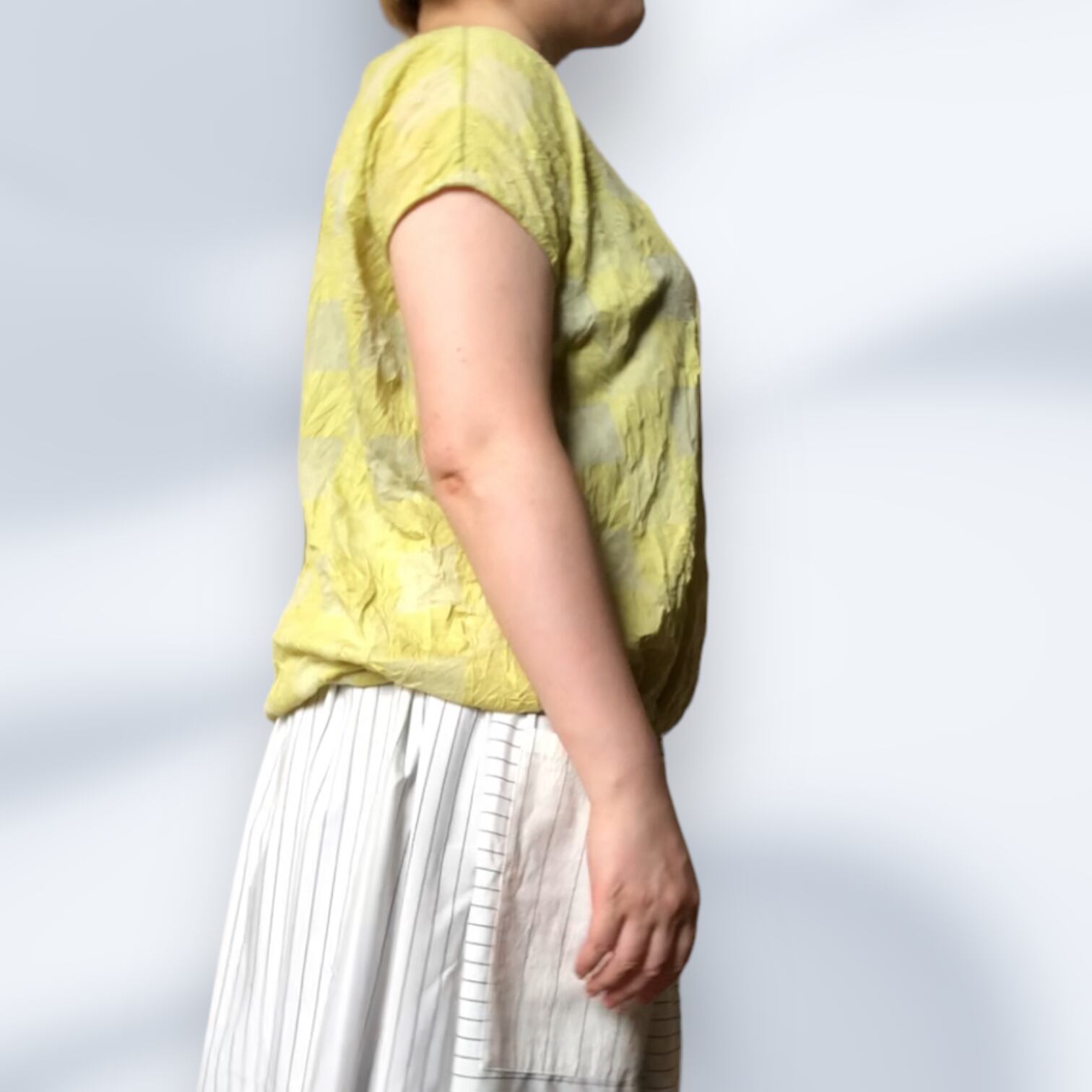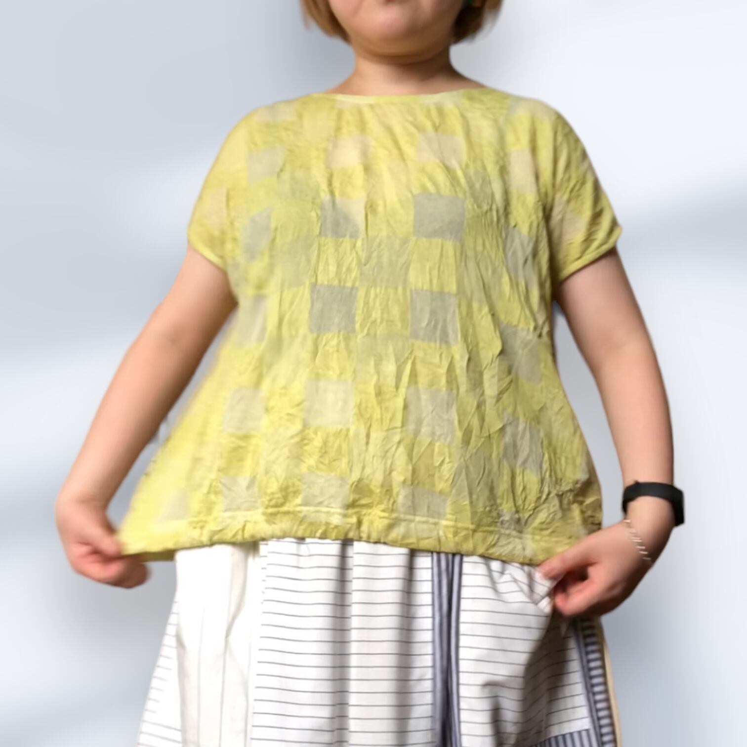 市松模様レモンイエローの尾州カットソー生地を使用したフレンチスリーブTシャツ