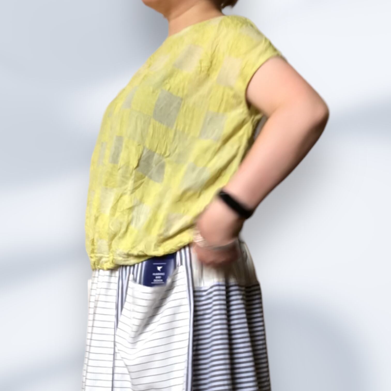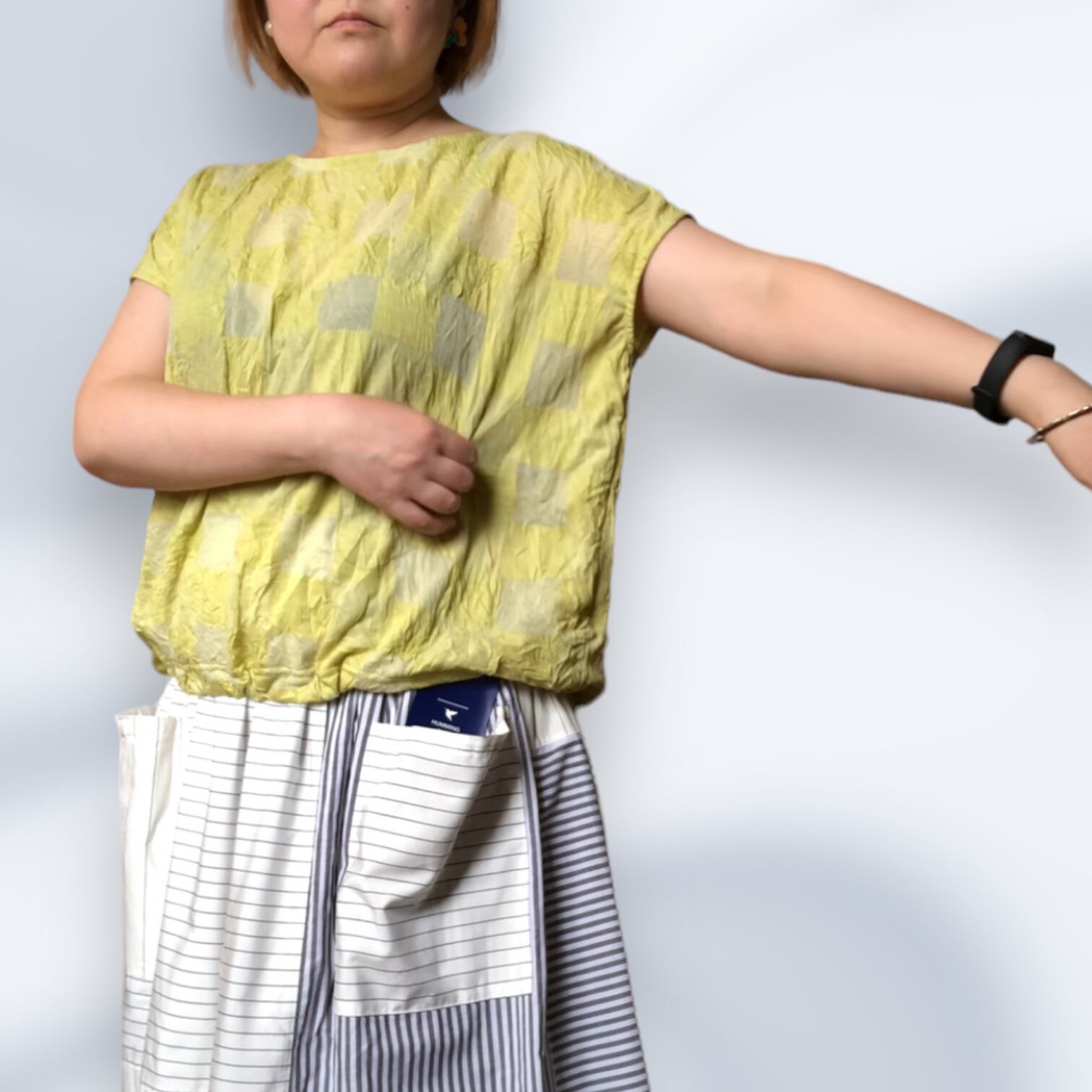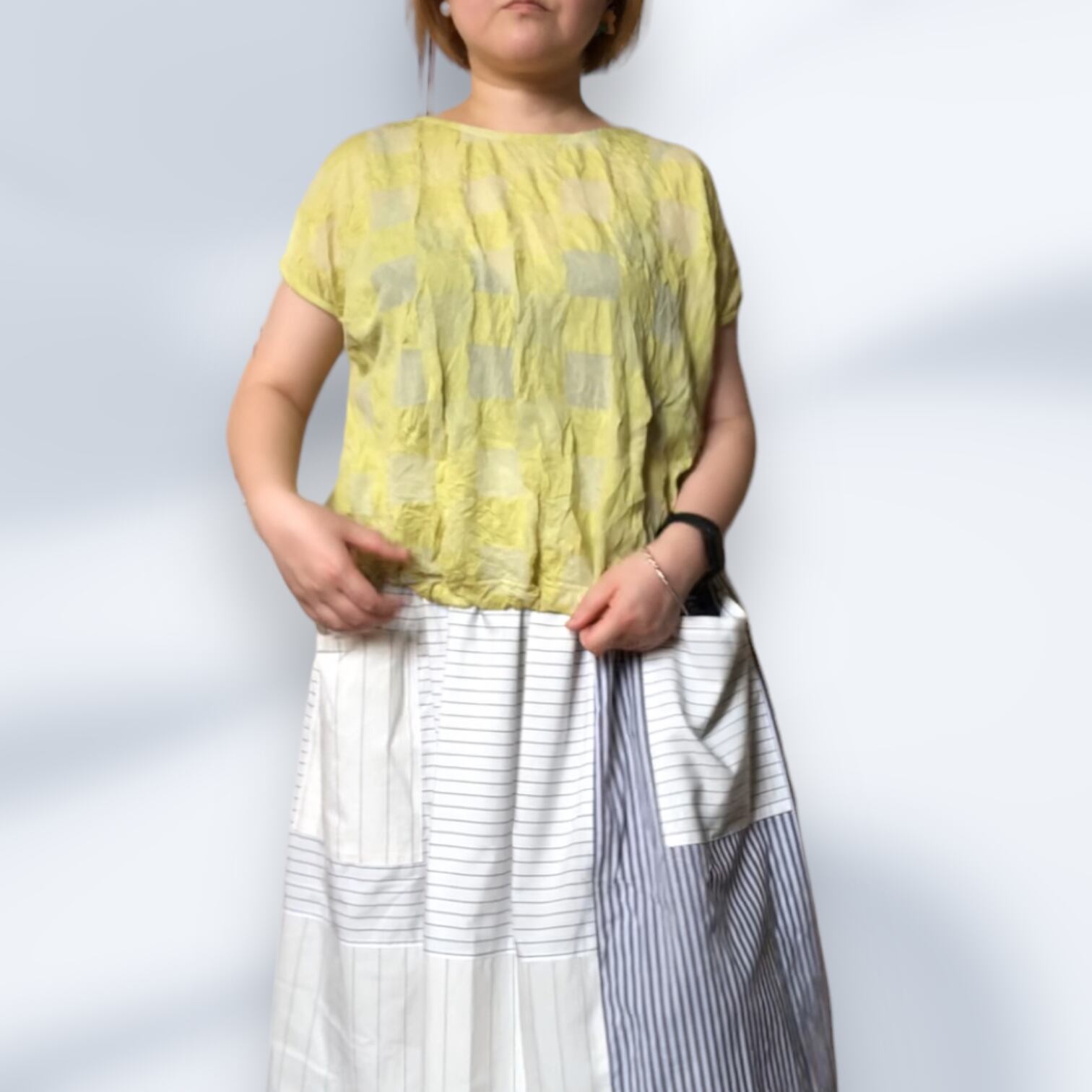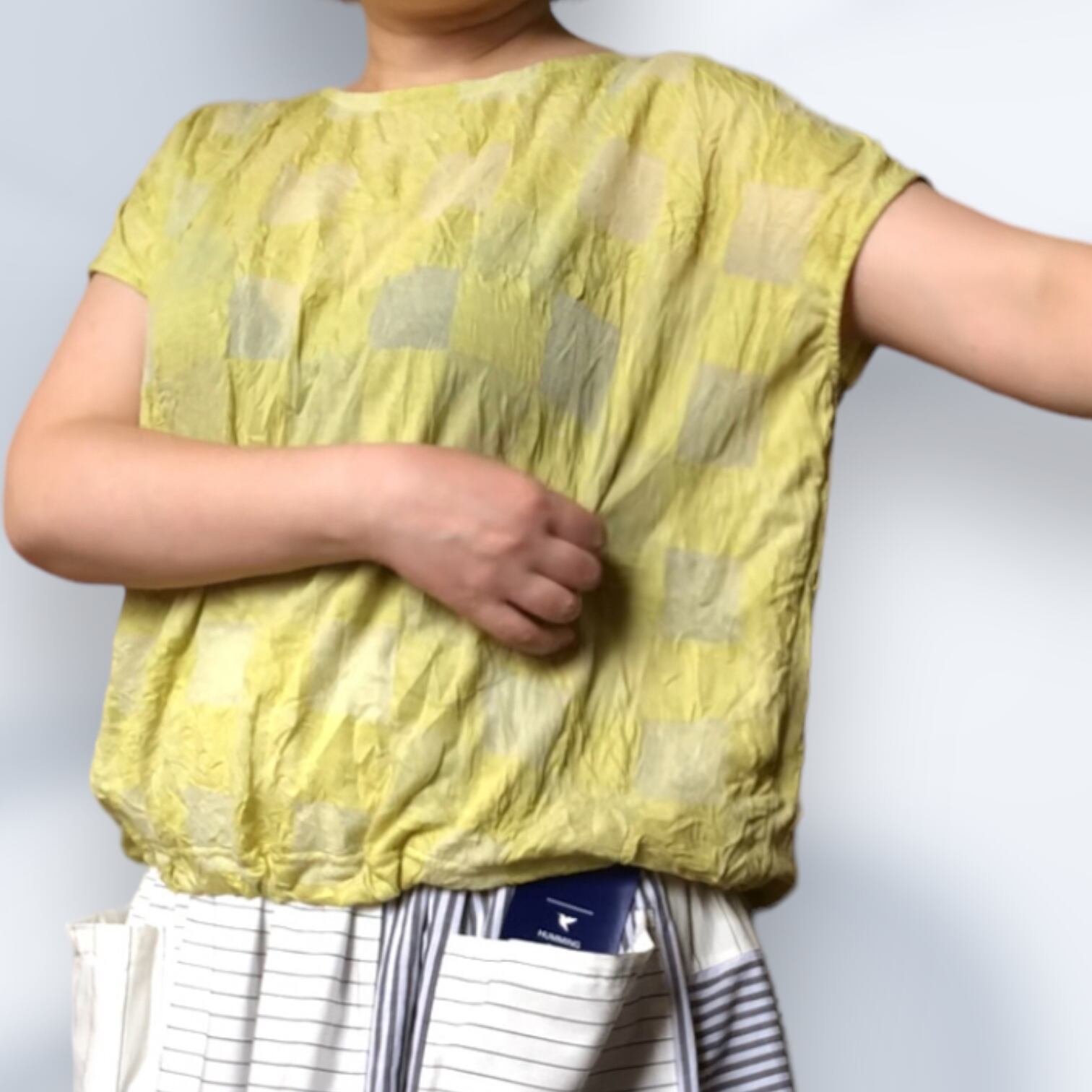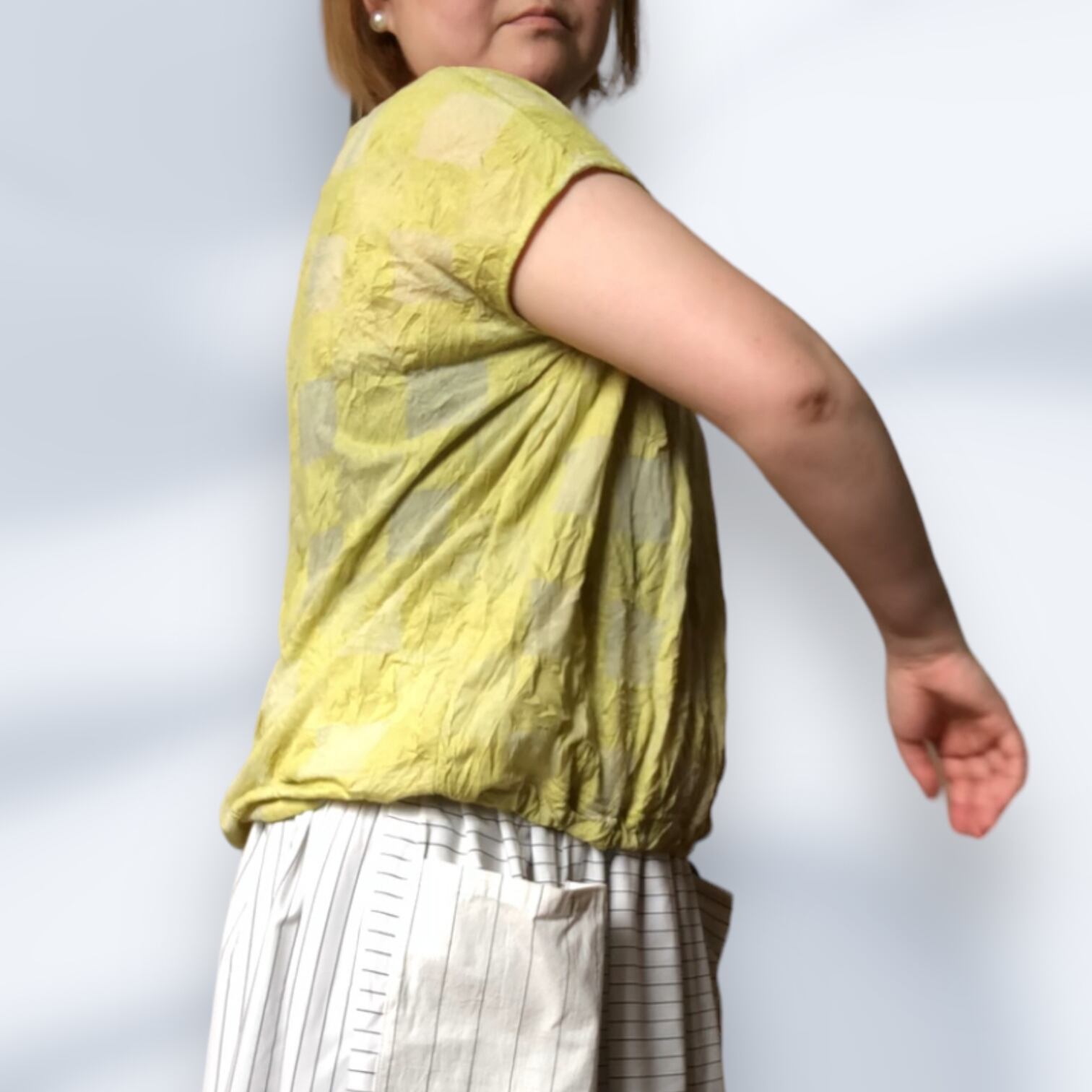 市松模様レモンイエローの尾州カットソー生地を使用したフレンチスリーブTシャツ