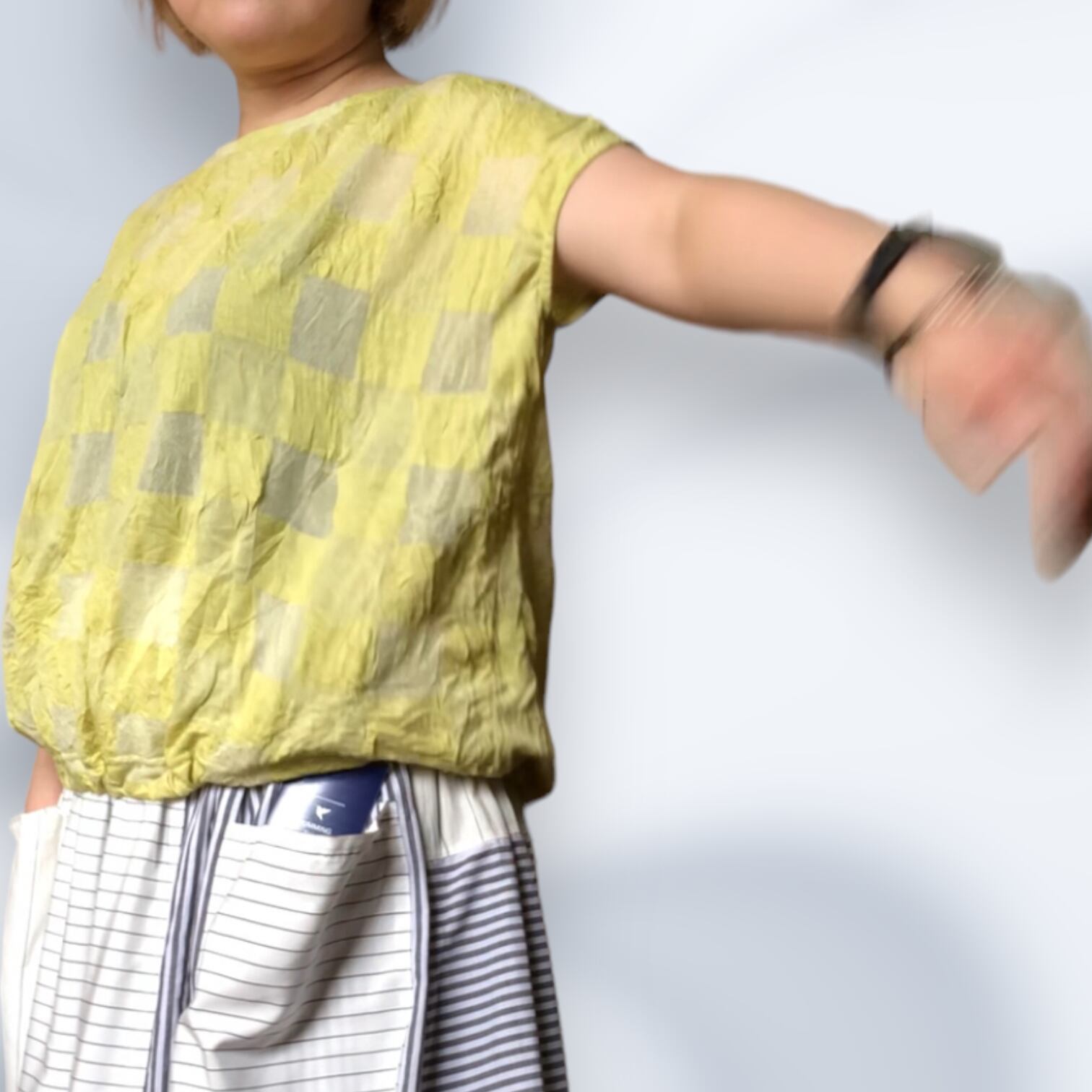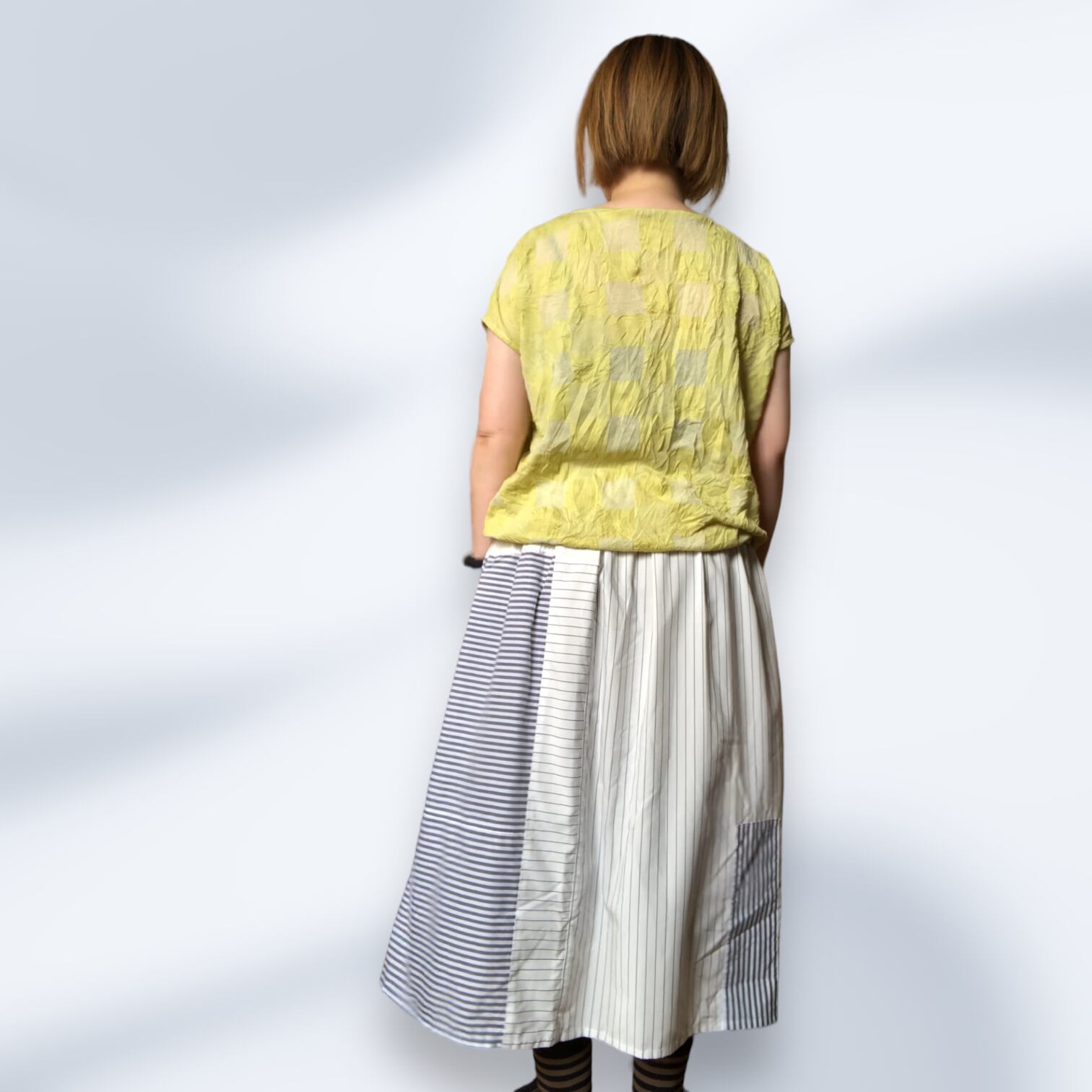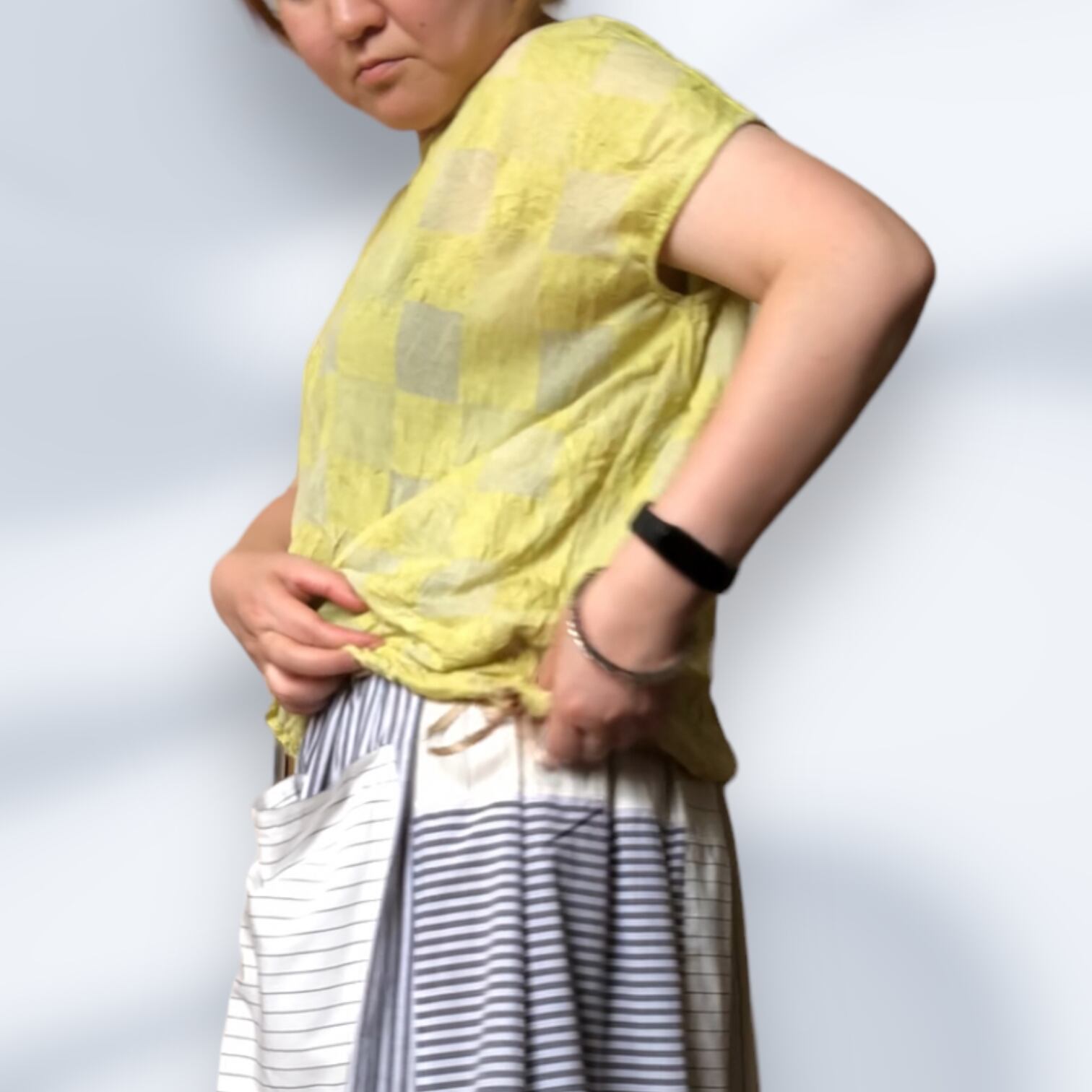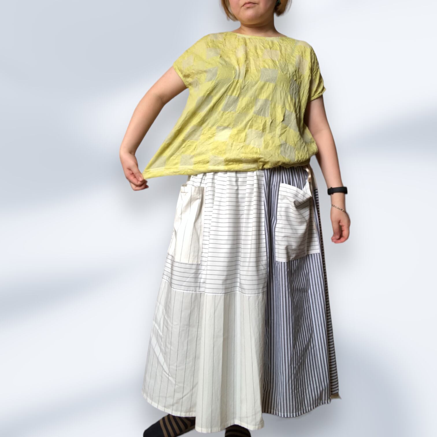 市松模様レモンイエローの尾州カットソー生地を使用したフレンチスリーブTシャツ