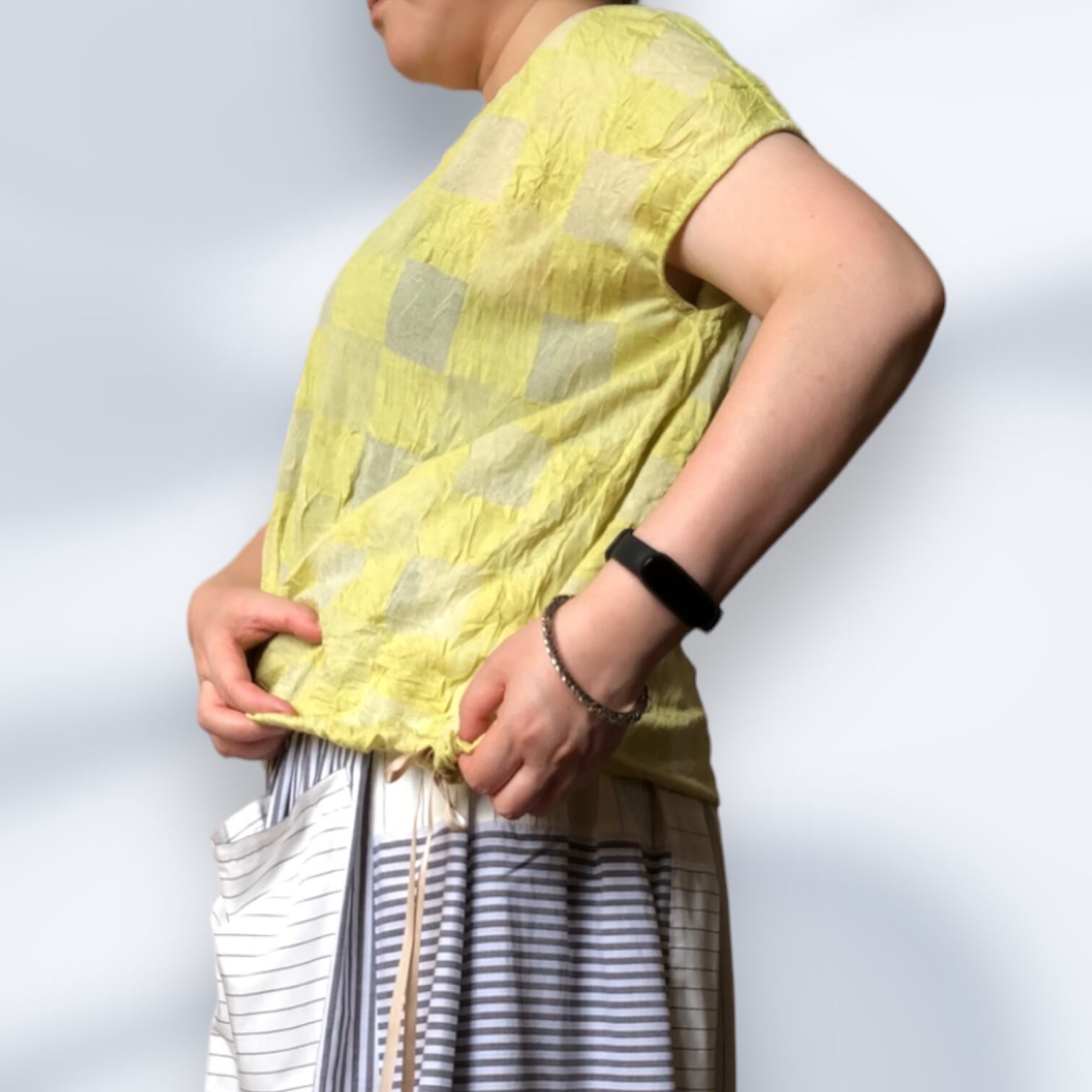 裾には伸縮性のあるリボンが入っているので、合わせるボトムによって見頃のシルエットを変化させて着ていただくことができます。
